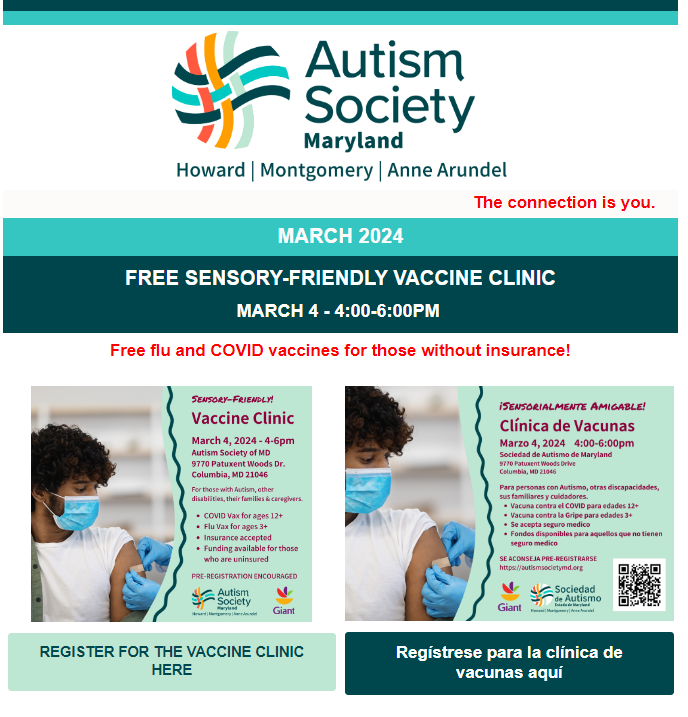 DetailsSENSORY-FRIENDLY Vaccine Clinic For individuals with Autism, other disabilities, their families and caregivers. Monday, March 4, 2024 from 4:00-6:00pm Nonprofit Collaborative, 9770 Patuxent Woods Dr, Columbia, MD 21046 REGISTRATION Encouraged…